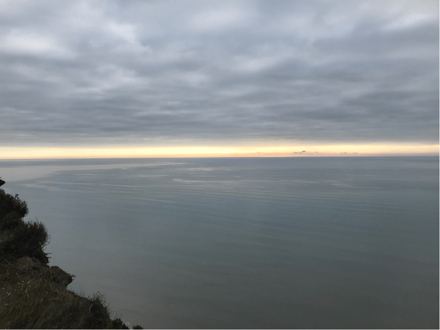 The wintery sky was typically indecisive with grey clouds blanketing the world, but a sharp strip of sunlight on the horizon added unexpected colour to the scene. Miniature ships glided across the still sea, and shafts of light burst through the cloud cover.