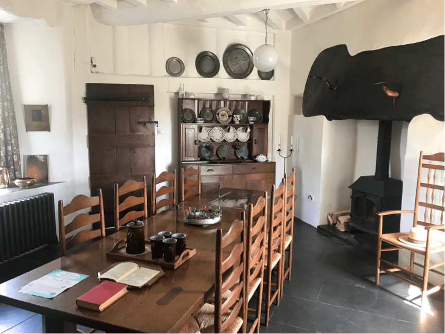 Firstly, the house is higgledy-piggledy. The front door leads straight into the kitchen, which has been preserved in a 1950s timewarp as if the family had just gone out for the day, and still contains furniture crafted by Ernest Gimson, such as the ladder-back kitchen chairs. A pantry leading off the kitchen and set lower into the hill was mistakenly constructed with a floor below the groundwater level, meaning it regularly floods.